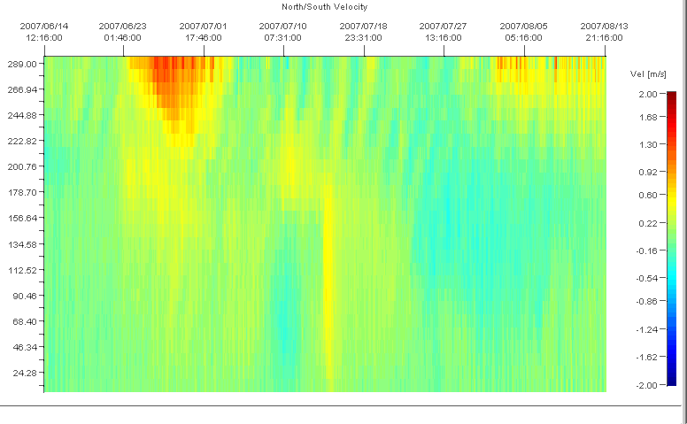 The plot shows the north-south componenet of velocity, which was collected at time intervals of 15 minutes and with 11 m resolution in the vertical